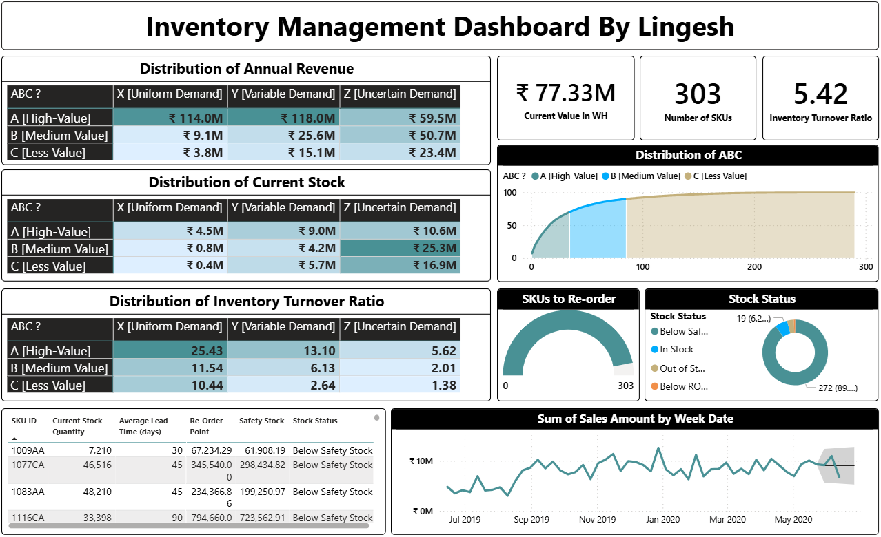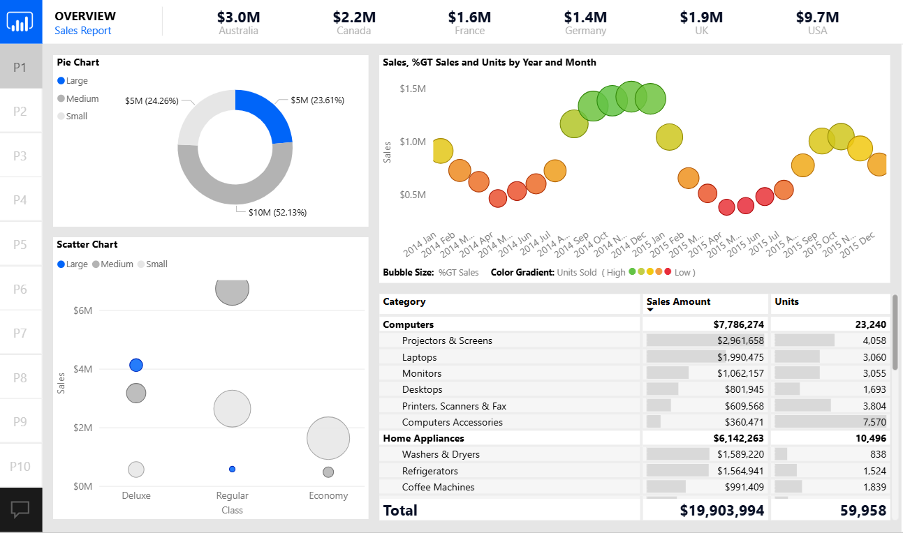 - Editable DAX measures, pre-built KPIs, filters, and navigation buttons